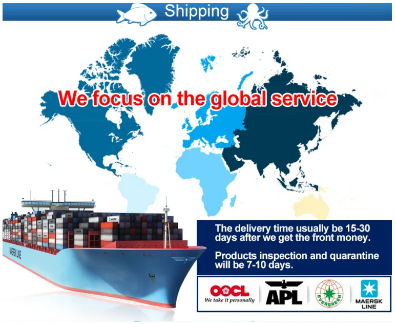Shipping Documents : | 1. Commerical Invoice 2. Packing List 3. Certificate of Origin 4. Health Certificate 5. Bill of Loading 6. Form A / Form E 7. Others fishing documents as per custmers' need |
