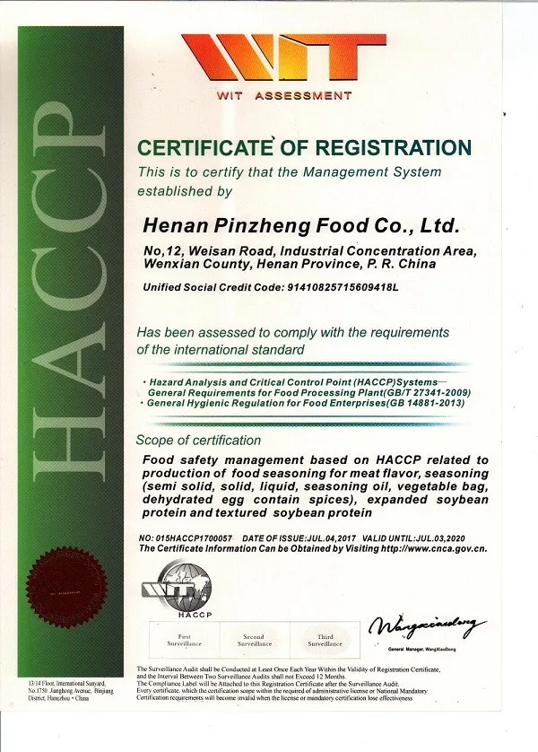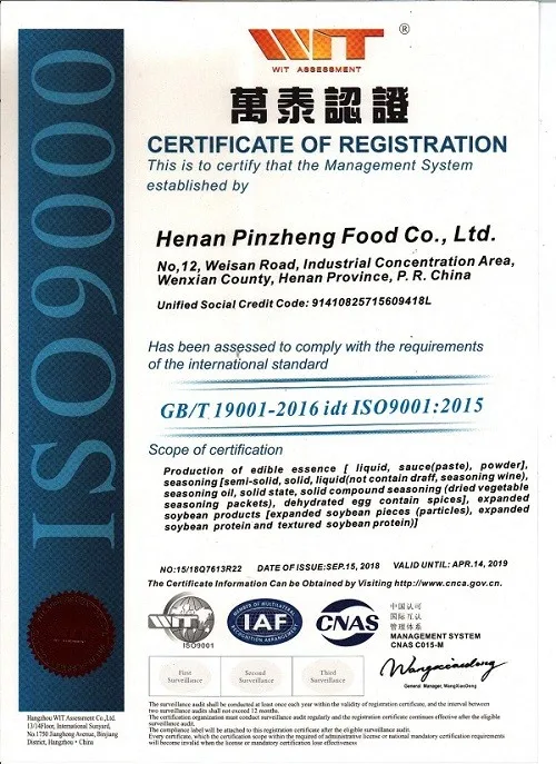 Henan Pinzheng Food Technology Co., Ltd. is located in Jiaozuo County, Henan Province. It is a modern food production enterprise integrating soy protein products and food ingredients research and development, production and sales. The company was founded in 1996. After nearly 20 years of development, it has more than 300 employees and 20 professional food researchers and three national food engineers. It has established provincial R&D centers and laboratory centers. The products have been formed in "Pinzheng" flavors, seasonings series products, "Pinzheng famous chefs" catering ingredients series products and "Aifude" vegetarian brushed protein products.