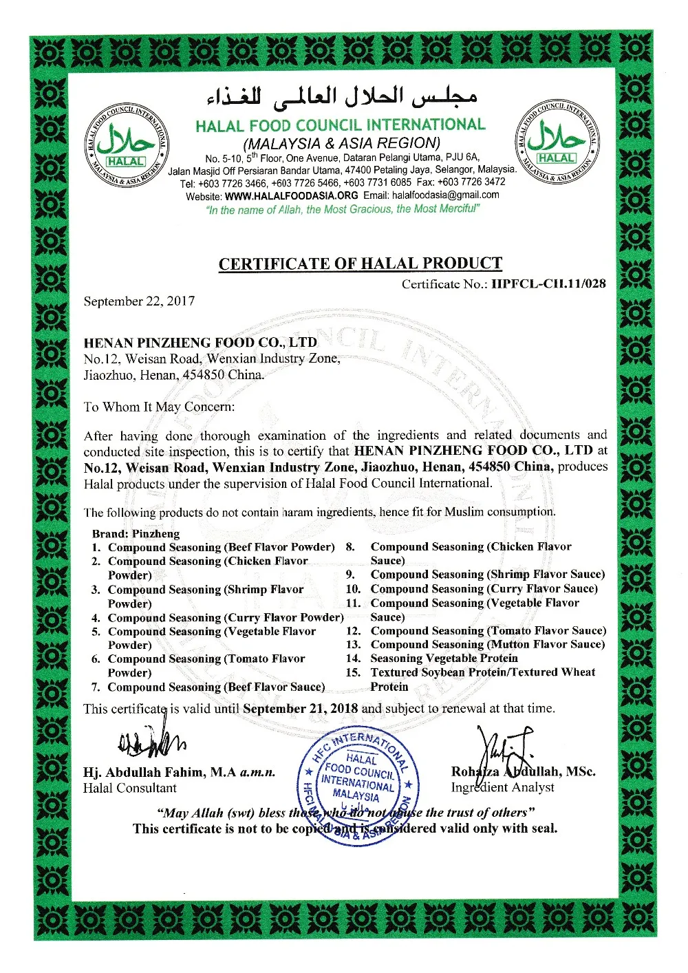The company is a modern factory with a building area of 18,300 m2 and an office building area of 6,500 m2. It has the first-class R&D center, laboratory inspection and testing center and product quality control center. In 2003, the company owned an independent management of import and export, and passed the ISO9001 international quality system certification. In 2013, it passed the ISO22000 food safety management system certification.