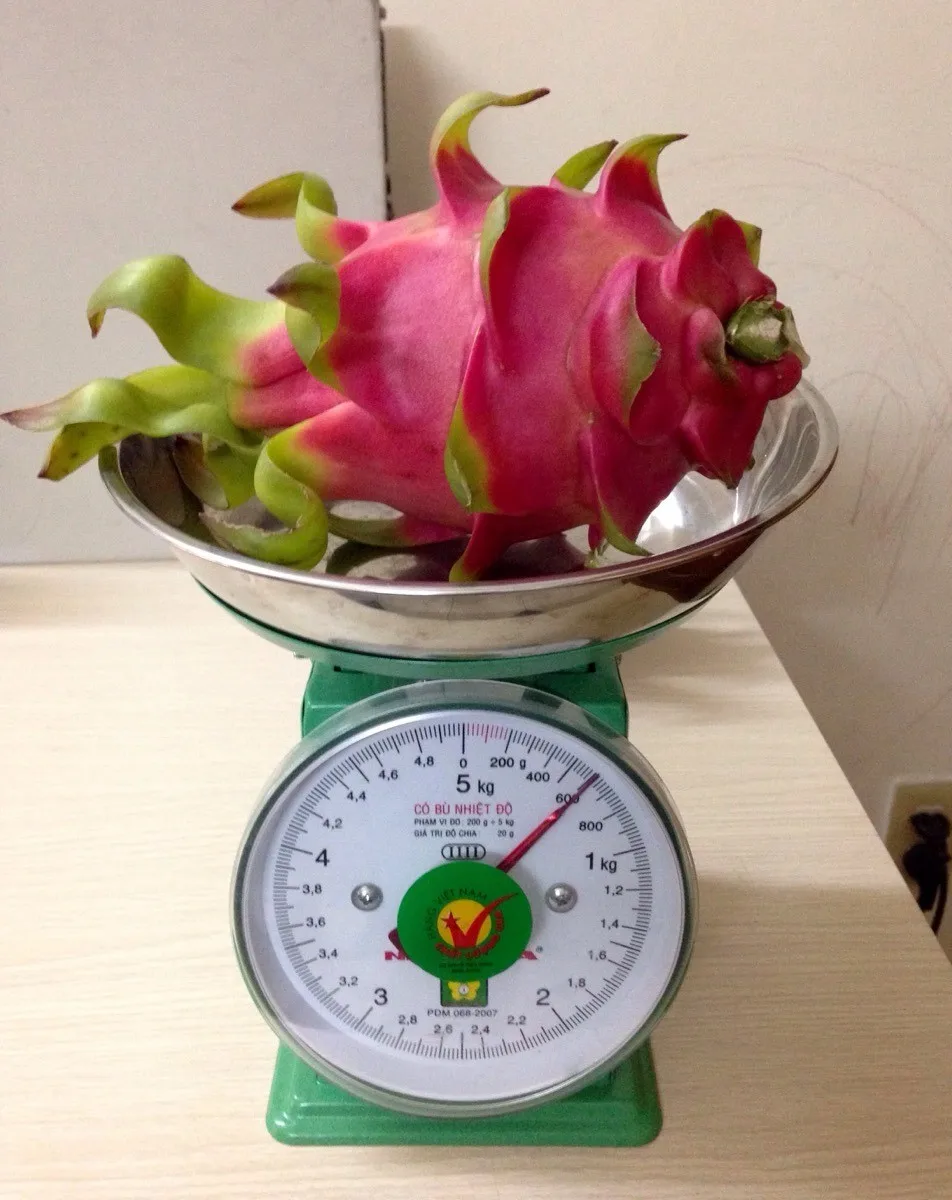 Red Dragon fruits grow on long, thin, vining cactuses that are often seen growing up trees, fences or walls. On the outside, Red Dragon fruits look almost identical to the white-fleshed variety. The brightly colored oblong fruits are about 10 centimeters in length and can weigh up to a pound.