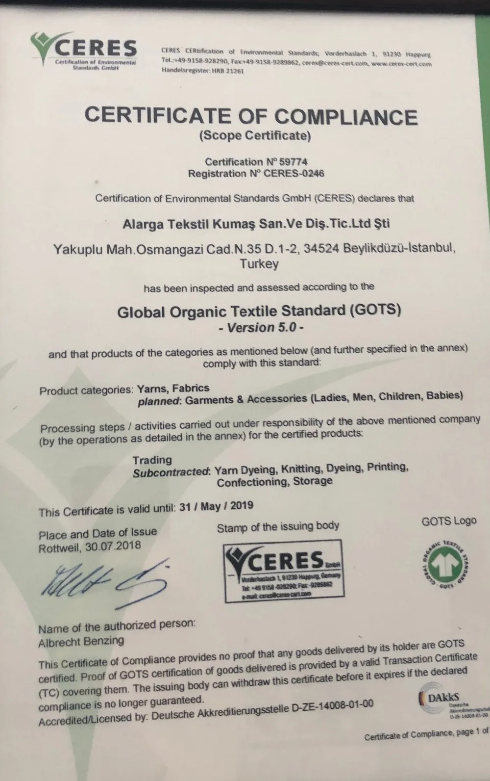 * GOTS and okotex class 1 Certified