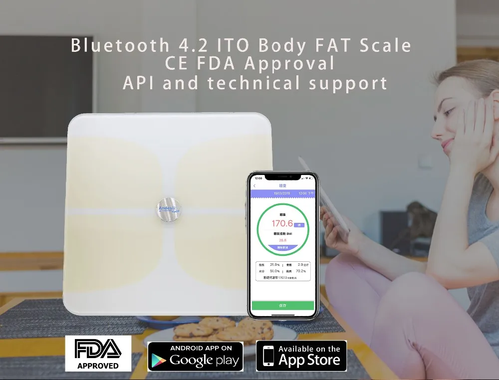 Our smart scale is available in black and pearl white, it shows seven aspects of body composition which including weight, BMI, BMR, body fat, bone mass, water weight and muscle mass. This scale give user a better understanding of body composition and data can be saved for self-monitoring.