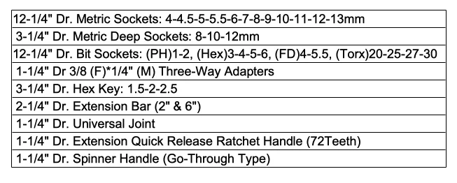 Our competency specialize in socket, wrenches, impact wrenches and various tools Etc, with strict top quality control processing under ISO & GS & TUV standard. All of item also making in accordance with DIN/ANSI/CE standards.
