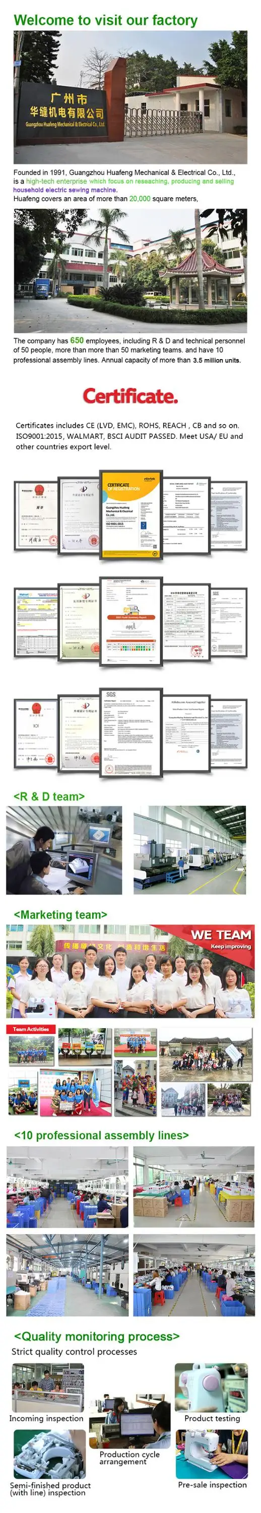 Founded in 1991, Guangzhou Huafeng Mechanical & Electrical Co.Ltd. is one of the most professional manufacturers for Household Sewing Machines based in guangzhou China with over 27 years histories. We are a high-tech enterprise that supplying customers with R&D, production, sales and after-sale service.We have over 800 staff and workers at the factory with area of more than 30,000 m2.The products we offer are mini sewing machine,multi-functional sewing machine,handheld sewing machine and accessories.