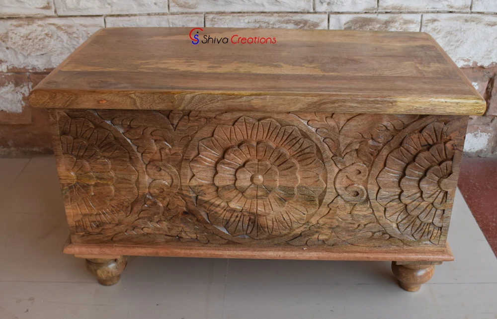 Hand carved mango wooden storage trunk blanket chest box add charm to your home/hotel/restaurant etc .Nowadays furniture is the need of every household. New furniture is available at very high rates. So to make furniture available at affordable prices we provide you the best industrial furniture.The furniture provided by us is durable and long lasting. It has the best finish. We have a wide range of mango wood furniture for offices, bed room, homes, restaurants, hotels, schools etc. We provide you with wardrobes, cocktail tables, dining tables, benches, beds, tables, chairs etc.