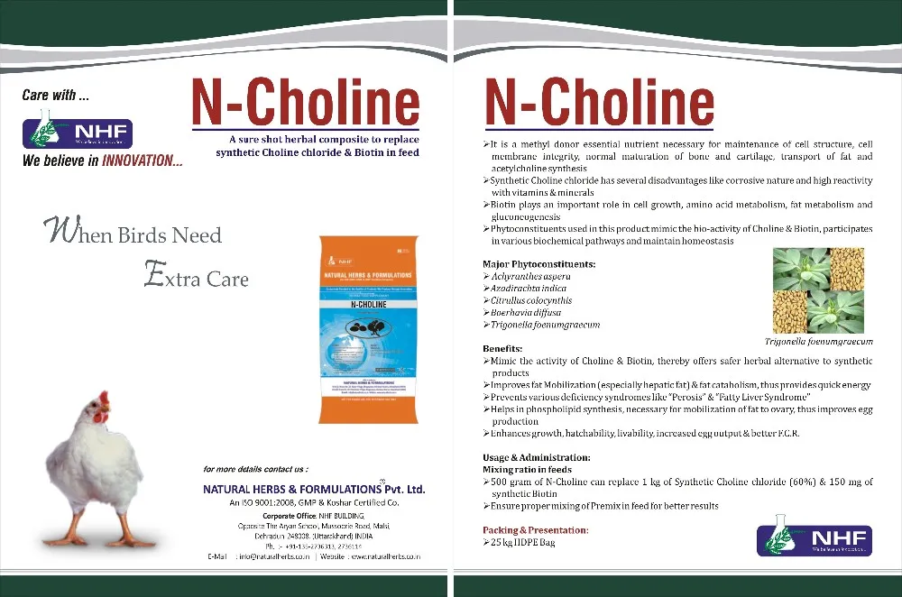 * Helps in phospholipid synthesis, necessary for mobilization of fat to ovary, thus improves egg production Enhances growth, hatchability, livability, increased egg output & better F.C.R.