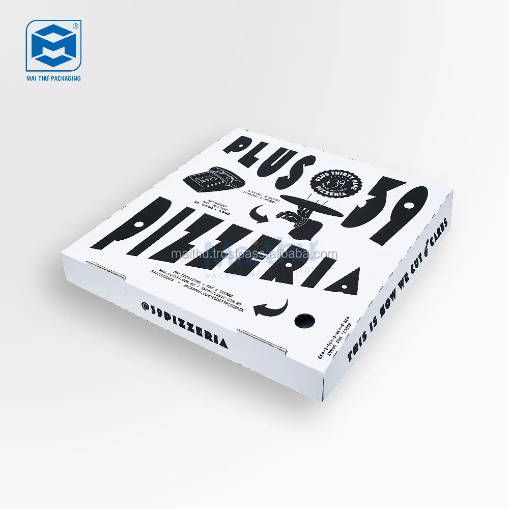 Mai Thu have 7 inch, 9 inch, 10 inch, 11 inch, 12 inch, 13 inch and 15 inch Pizza Boxes. The boxes are square-shaped and come in one piece.