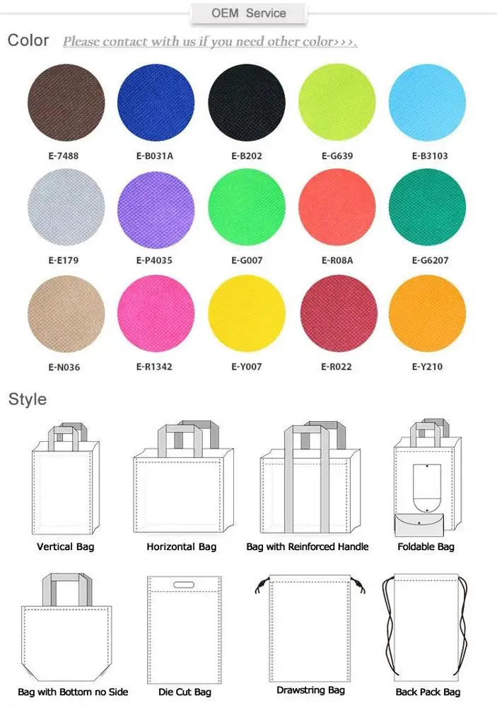 Our Main products are non woven bags with/without lamination, PP woven bags, cooler bags, folding bags, drawstring bags, 190T bags, cotton canvas bag, jute bag etc. Our products are all LEAD/AZO/CADMIUM free.