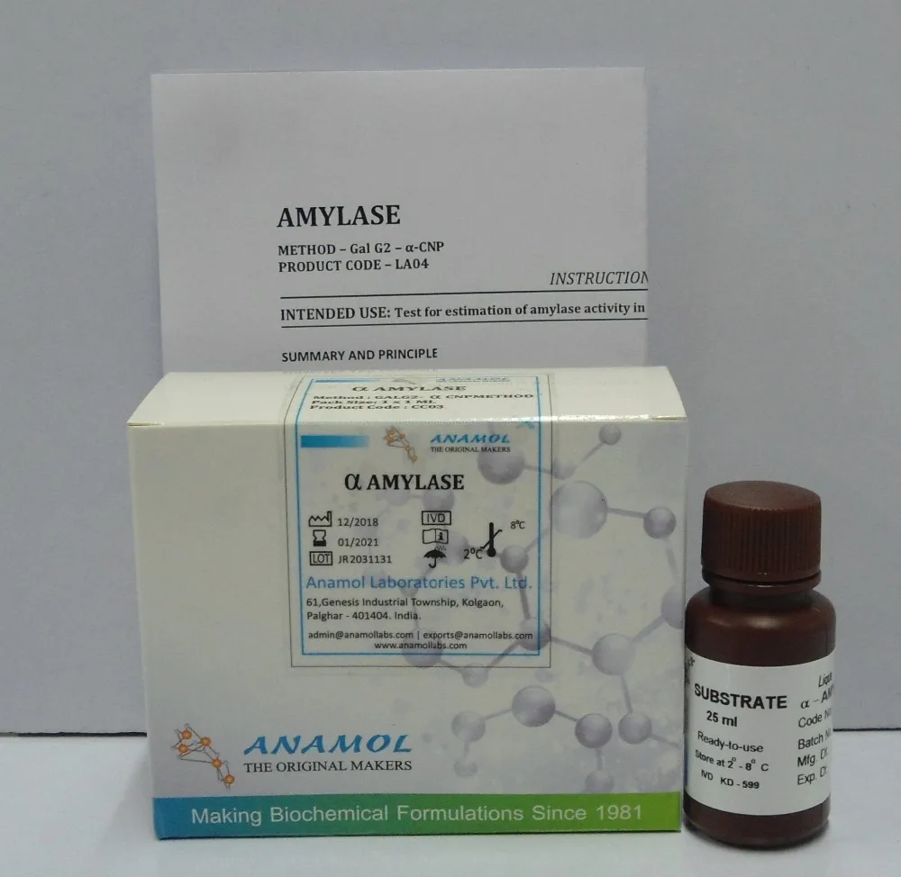 α-Amylase determination is useful in diagnosis of diseases of Pancreas and Parotid gland. Elevated serum levels are associated with acute pancreatitis, acute abdominal disorders, biliary tract diseases, diabetic ketoacidosis, severe glomerular dysfunction, ruptured ectopic pregnancy and macroamylasaemia. Amylase activity in estimated in serum / plasma using GalG2-α CNP kinetic method.