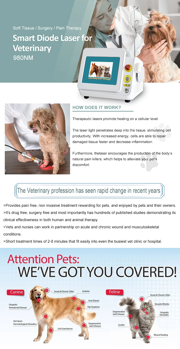 strengthen muscle and tissue, improve mobility and enhance your dog's overall quality of life almost immediately Laser therapy provides you with a safe and effective alternative to drugs and surgery. You can see results within 3 to 5 short treatments.