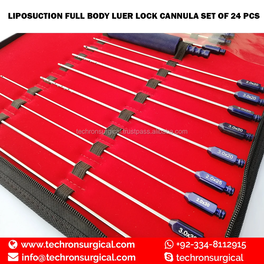 You can buy complete range of Liposuction Cannulas, Liposuction Cannulas Sets, Fat Transfer / Injector Cannulas, Infiltration Liposuction Cannula Set, Fat Grafting and Harvesting Cannulas, Lipo filling Cannulas Such as Luer Lock Cannulas, Super Luer Lock Cannulas, Fixed/One Piece Power Handle Cannulas. Threaded Handle Cannulas, made with Stainless Steel Material, 60cc Toomey Hub Cannulas, Aluminum Handle Cannulas, for Face, Fore Head, Chin, Neck, Breast, Buttocks, Thigh and Lower Leg. And all other Liposuction Cannulas accessories, Such as Nano Fat Transfer with 3 Anaerobic Fat Transfer Adopter, Fat Transfer Gun, Adaptors Luer lock syringes, Connection, Stop Locks, transfer. All the Instruments of exceptional quality made with German stainless steel, Korean stainless steel and imported aluminum, autoclave-able at 134° steam hot for 15-20 minutes and reusable with Lifetime Warranty.