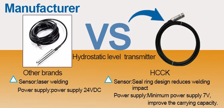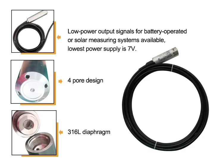 1.use high quality cable with air duct; can choose field display; 2.two kinds of sensors are optional, various application conditions, ceramic sensor with big hole design, anti-blocking, anti-corrosion. 3.use imported silicon piezoresistive sensor with high accuracy and good stability; 3.directly put into the measured liquid, simple installation.