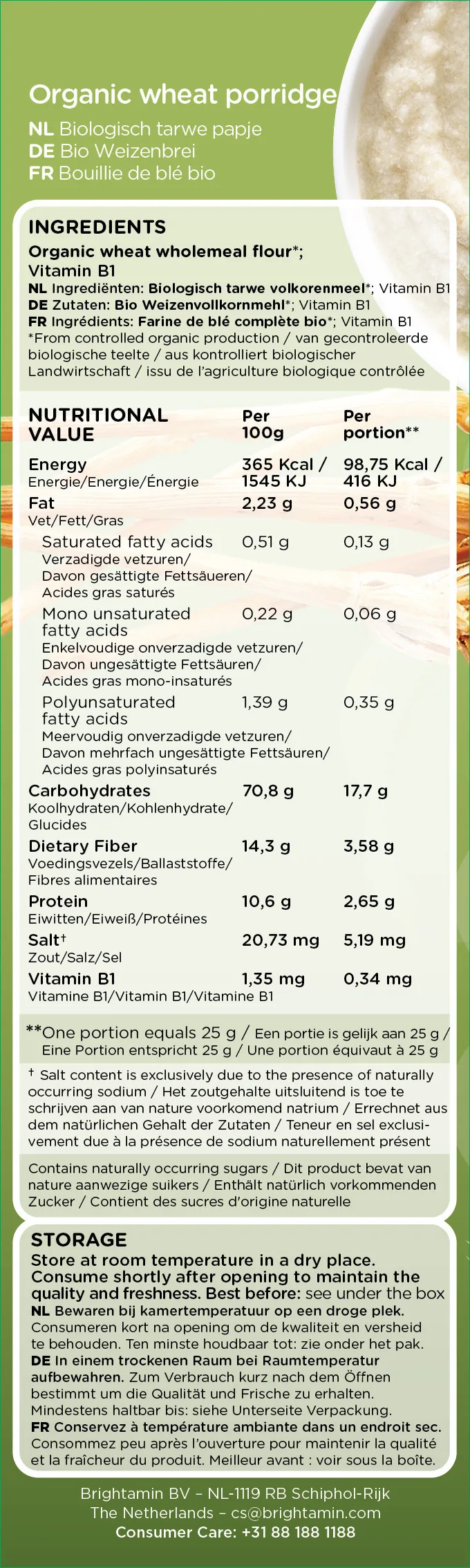 Brightamin Bio Organic Wheat Porridge (ready to mix with water or milk)