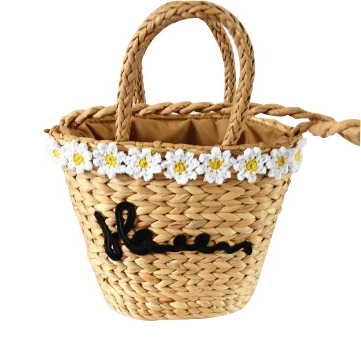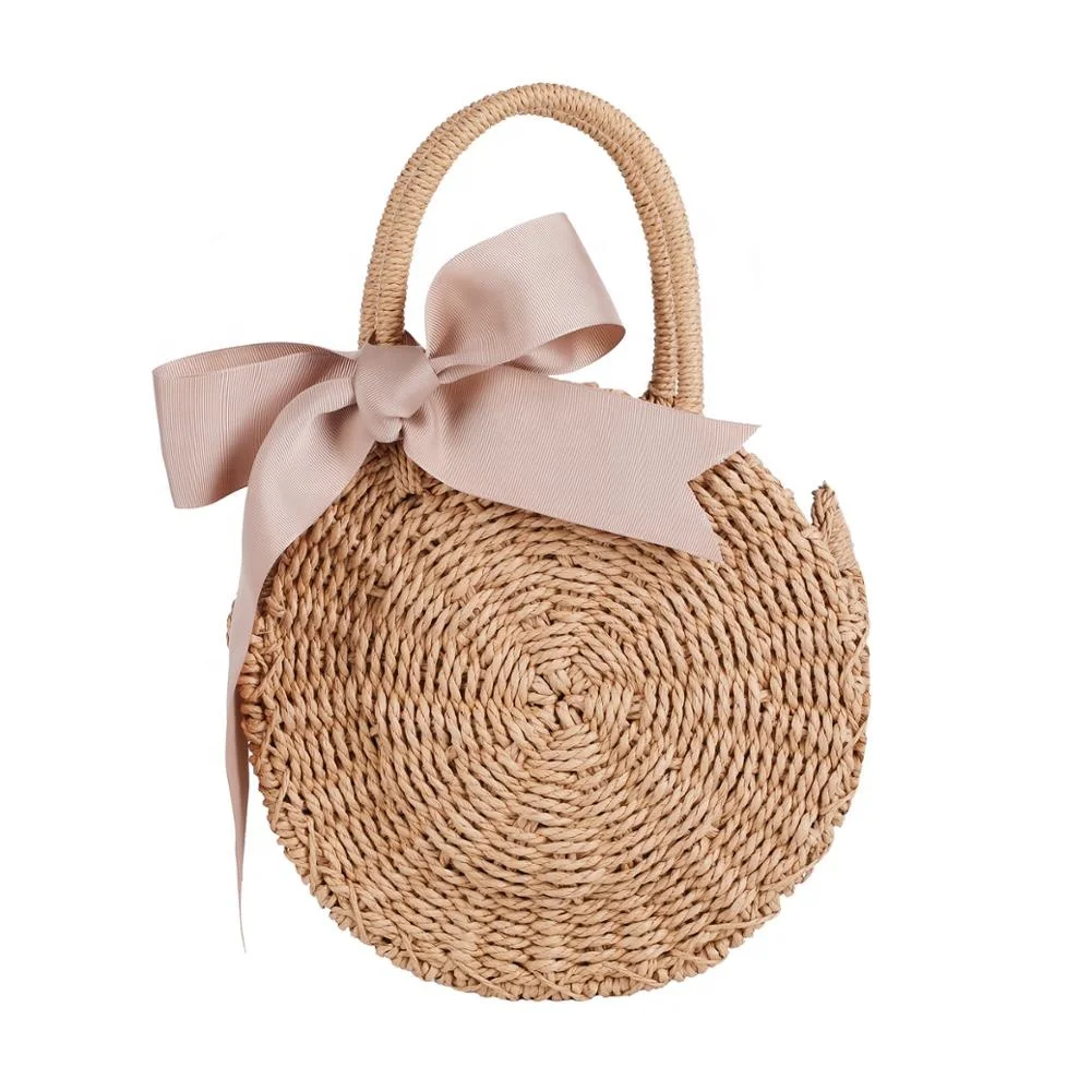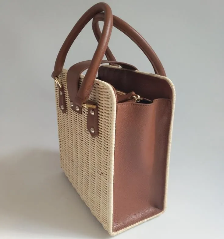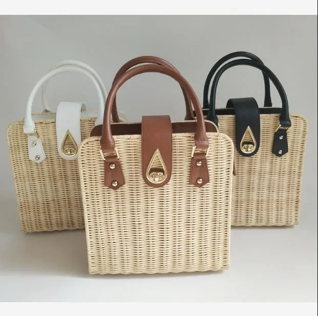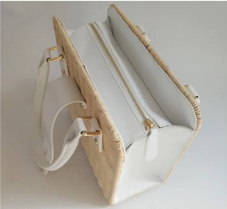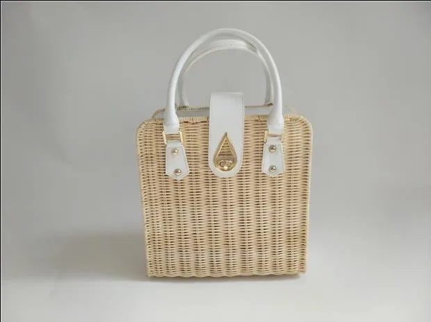 Factory outlet rattan and PU handle woven straw small white lady hand bag