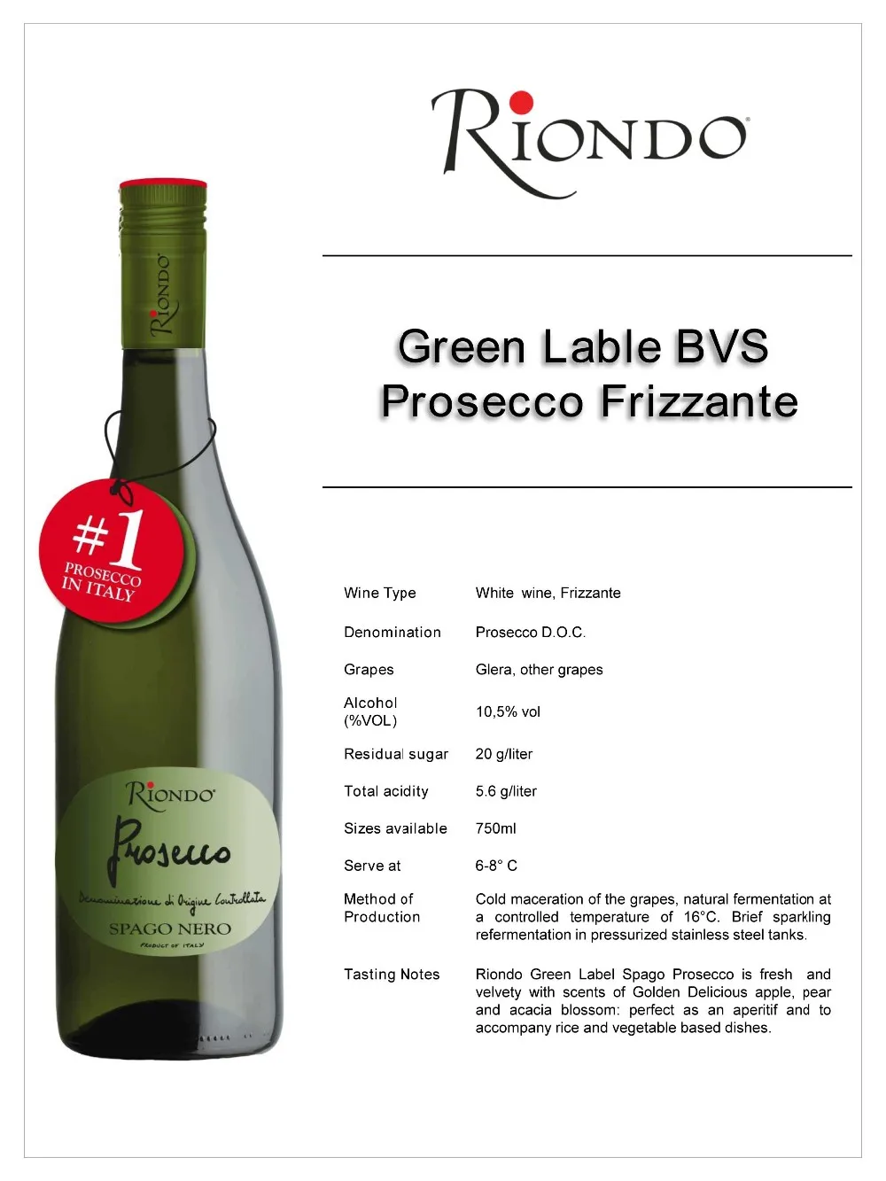 Extra Dry Spumante, fresh and velvety with scents of Golden Delicious apple, pear and acacia blossoms.