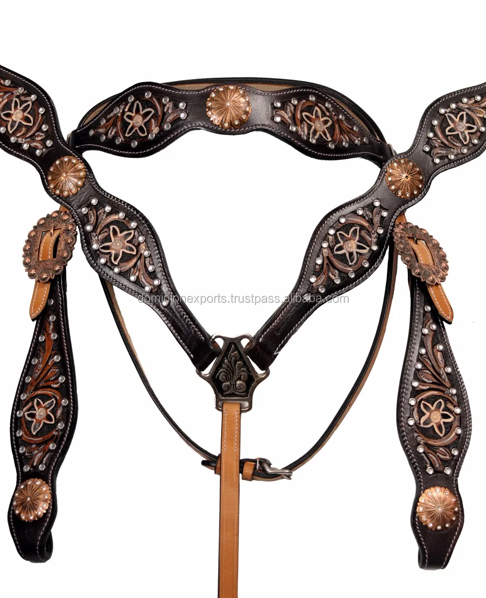 This is a unique combination of gorgeous Headstall and Breast Collar constructed of High quality thick 100% leather, carefully handmade with all the required precision to give the most unique look on an arena or a trail.