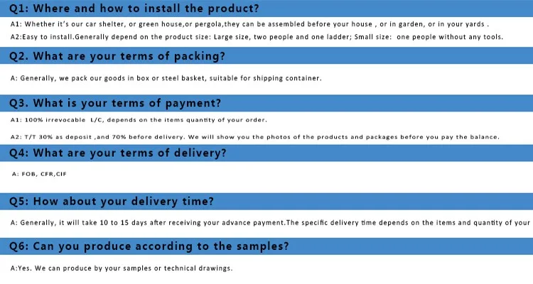 The car shelter has the feature durable and easy to assemble,can protect your car from rain,wind,and snow.And it can also be used as garage,with the shelter,you can store woods,boats,and stuffs that are not often used.Many models for your choices,can also be widely used in industry and agriculture as your requirements.
