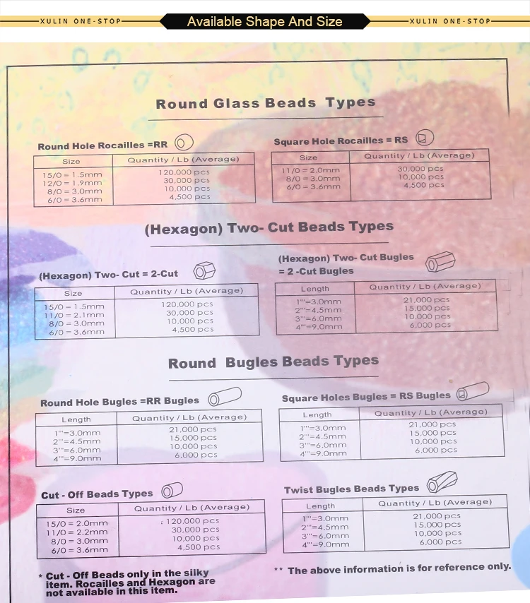 | Package | 15/0=1.5mm,(120000pcs/bag) 12/0=1.9mm,(30000pcs/bag) 8/0=3mm,(10000pcs/bag) 6/0=3.6mm,(4500pcs/bag) |