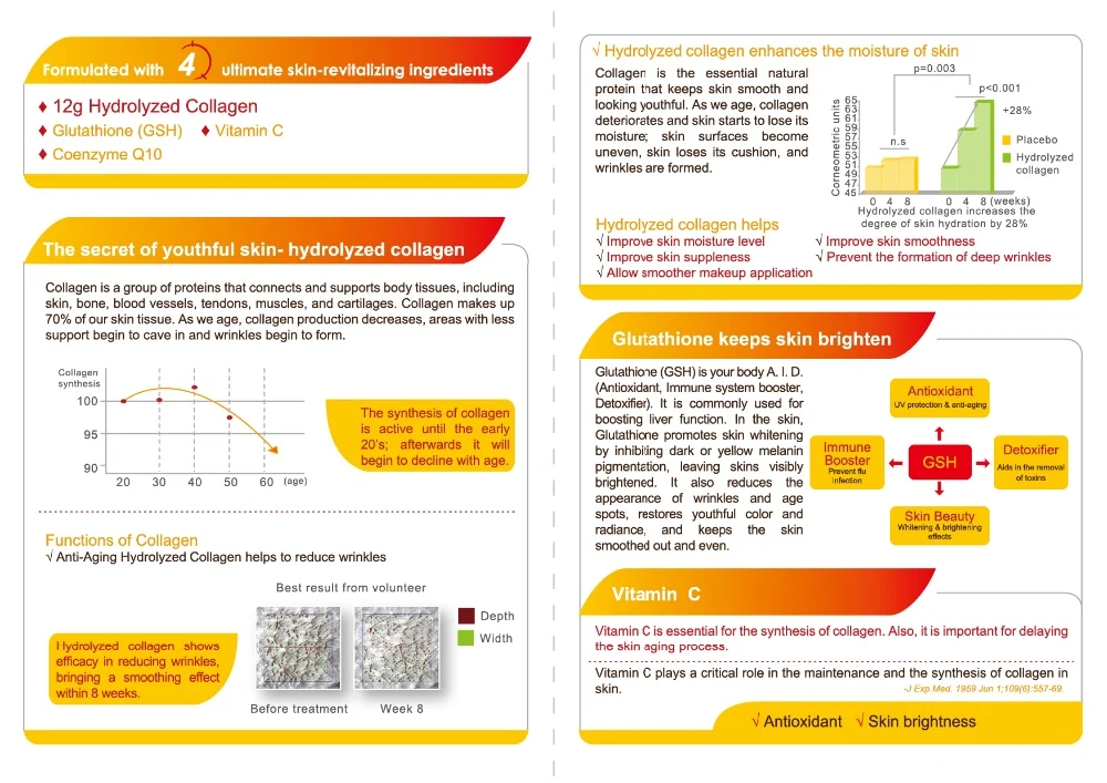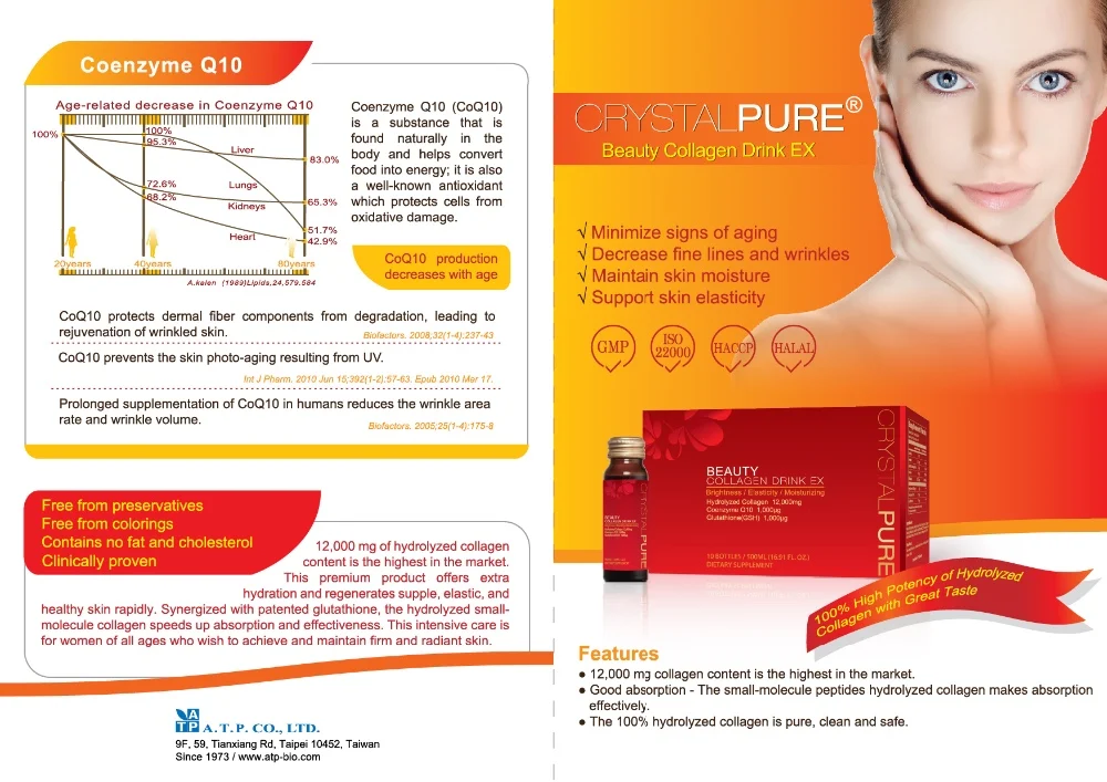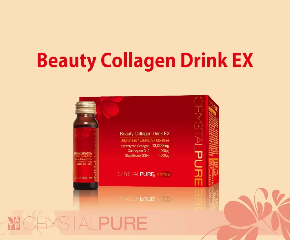 CRYSTALPURE Beauty Collagen Drink EX contains 12,000mg of collagen in each bottle, which is among the highest collagen content per drink on the market. With auxiliary ingredients such as patented Glutathione, Coenzyme Q10, and vitamin C, it not only replenish the collagen naturally lost with age, but also provides strong anti-oxidizing effects for maintaining skin integrity.