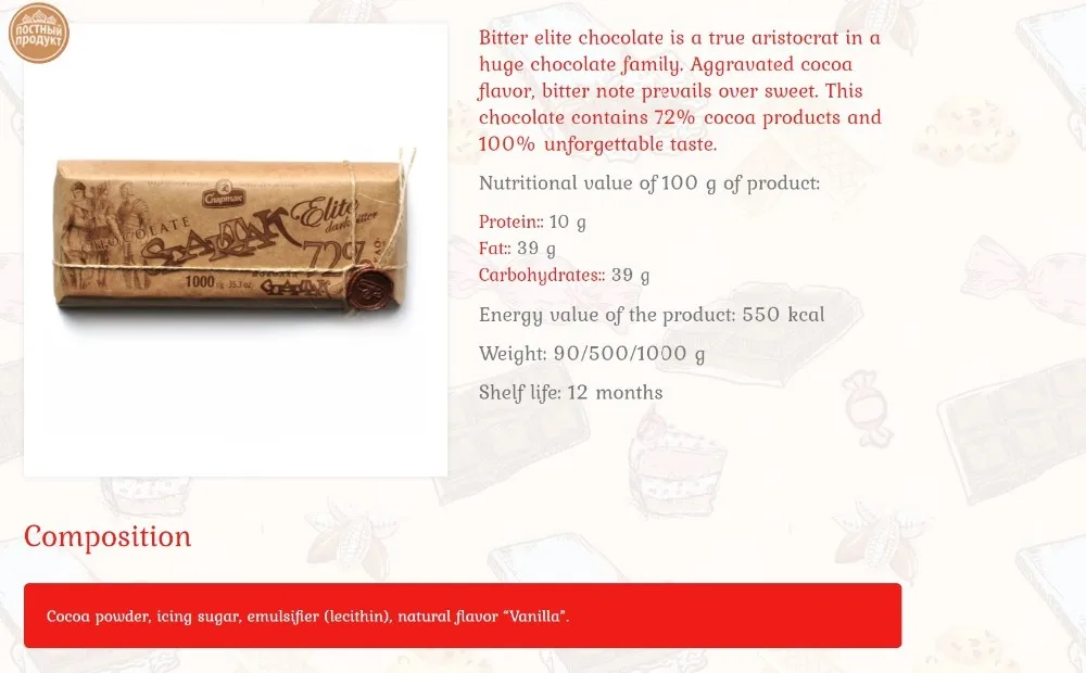 We are pleased to offer you our high-quality chocolate products. The main types of products manufactured by the factory are: caramel, sweets, chocolate and chocolate products, cookies, wafer products, cakes and pastries. At the factory today there are 4 main shops: biscuit, caramel, waffle, candy and chocolate, where the above-mentioned types of products are produced in a wide range.