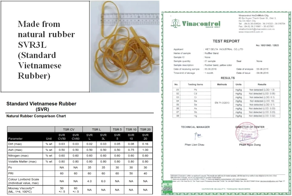We are Viet Delta Industry. We are one of the firms specialized in producing rubber products in Vietnam. Our company has more than 15 years of experience in exporting rubber products to many countries such as Canada, USA, France, Spain, Turkey, Egypt, India, Iran, Singapore, China, Hong Kong, Taiwan, and Australia... Our products include rubber band, rubber gloves, and tapes. The below is description of Rubber Bands.