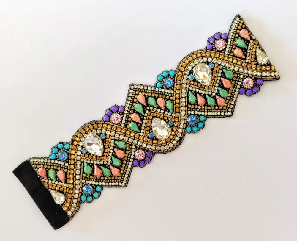 This Bracelet is hand embroidered with rhinestones, large silver crystal drops, opaque turquoise, pink and green stones. Leather backing and magnet clasp.