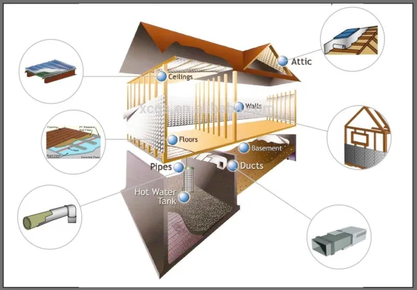 Especially in houses/metal&steel buildings/roof/attics/ceilings/walls/floors/pipes/basement walls/frame buildings/garage doors/pole barns/poultry barns/crawl space/etc.