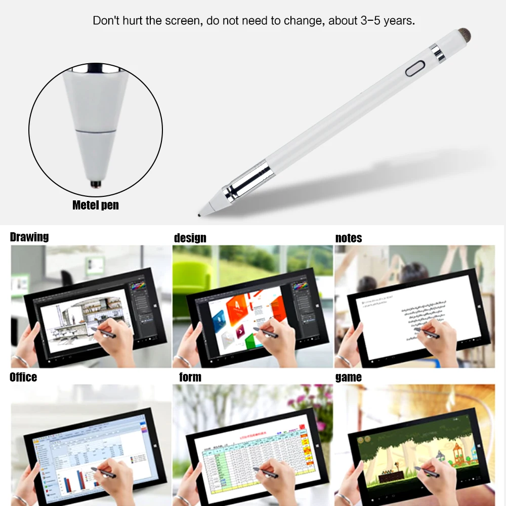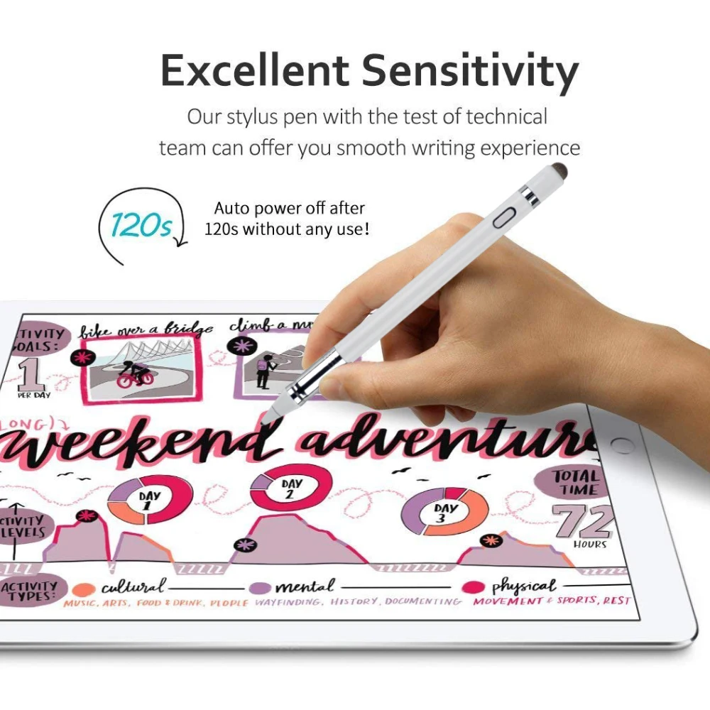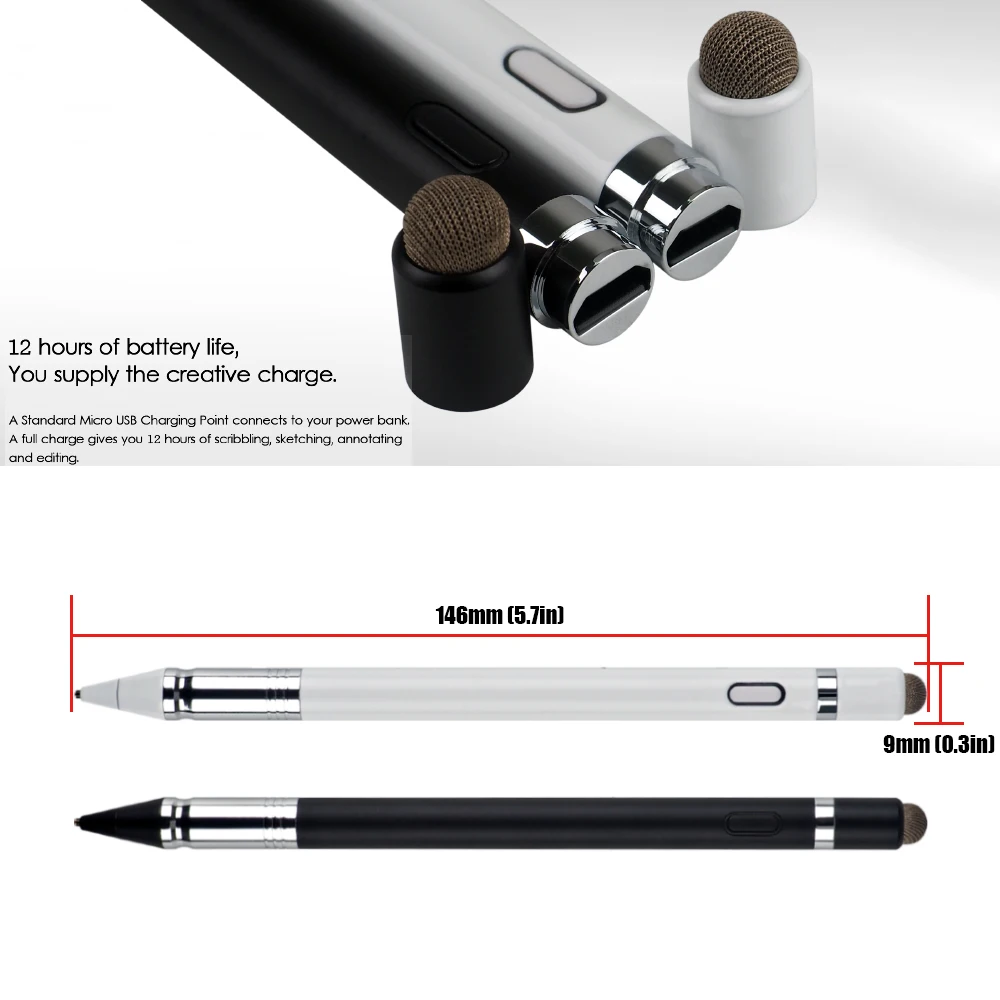 No need to install BT or Apps, just turn on this active digital pen by simply touching the cap button, it will automatically turn in "Sleep Mode" after idle for 30 minutes to save power. 15 hours of continuous working, 80-100 mins charge, 365 days standby time.