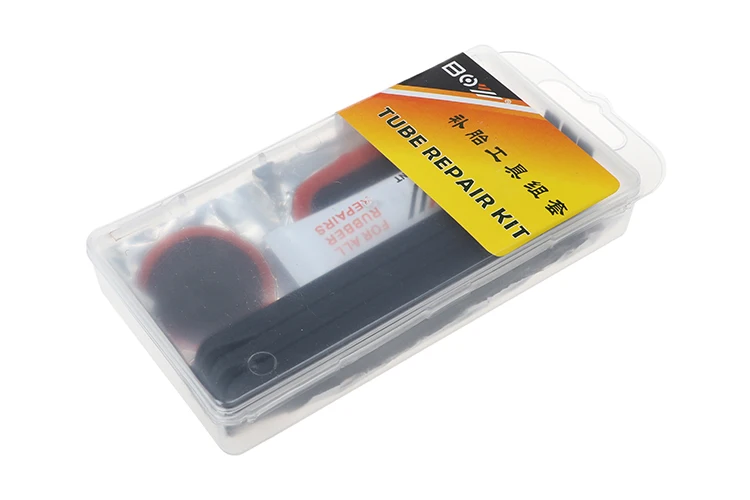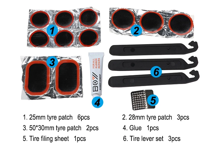 Items | 25mm tyre patch *6pcs 28mm tyre patch *3pcs 50*30mm tyre patch *2pcs Glue *1pcs Tire filing sheet *1pcs Tire lever set *3pcs Valve core pipe *2pcs |