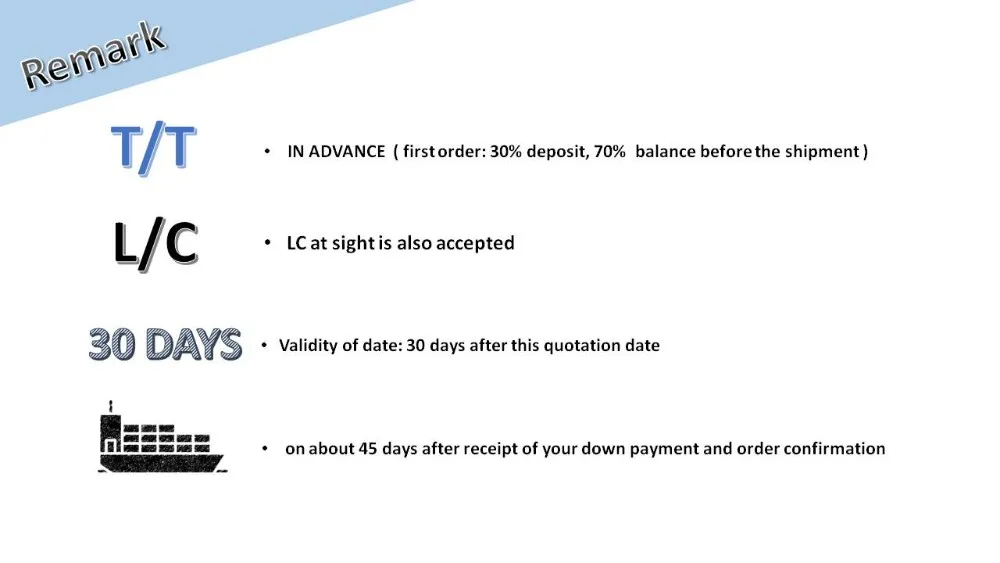 Q: What kinds of payment terms are acceptable to you? A: 30% advanced and the 70% balance paid before all good load. T/T or L/C at sight.