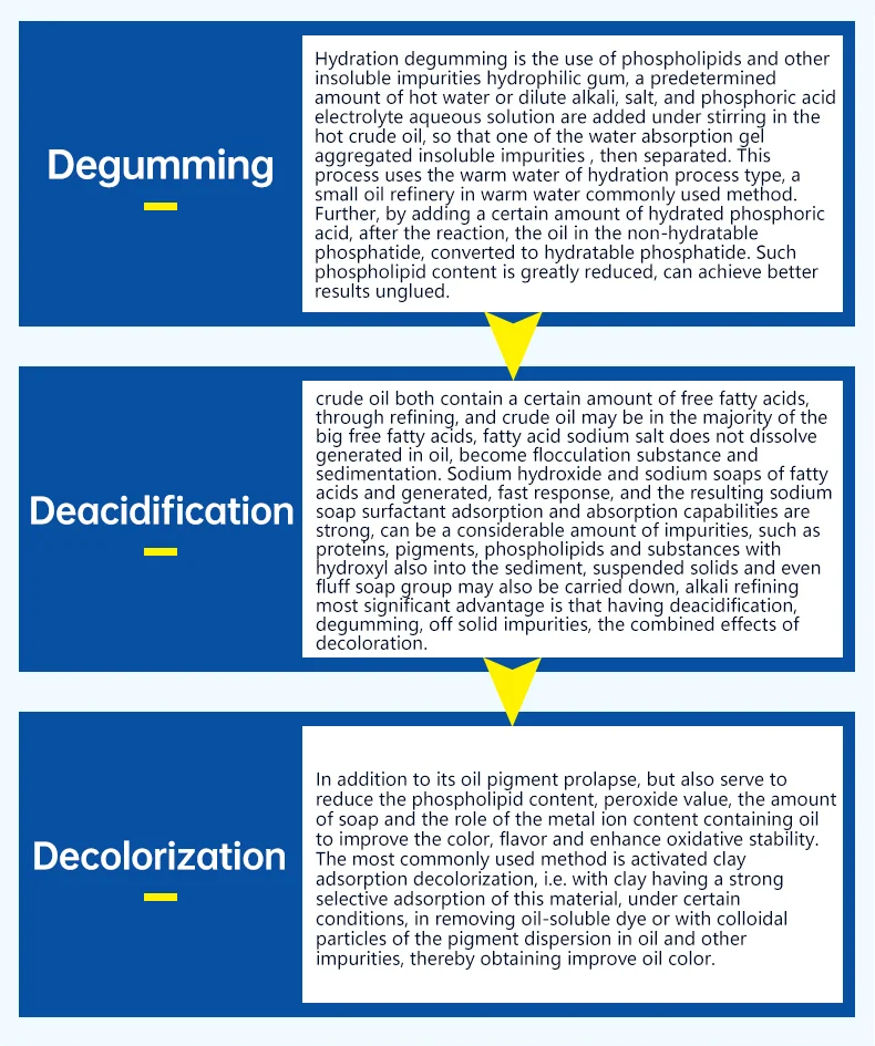 Working principle of il refining machine: Detailed process of our small edible oil refinery machine: Crude oil-→deguming and deacidification-→decoloring-→fine filtering-→final product oil-→process finished Operation: 1.First step:It is to purify the oil and remove the waste in the oil first time. 2.Second step:It is to purify the oil and remove the waste again to make oil more clean. 3.Third step:It is to remove the bad smelling of the oil, so to make the oil better and no smelling. 4.Oil filter:It is to fil the oil to make purified oil arrive good quality oil, and can meet people edible need.