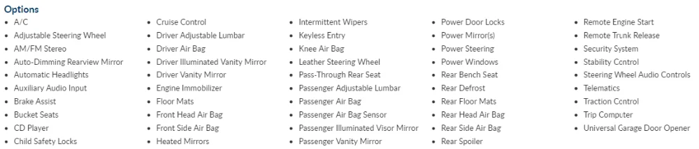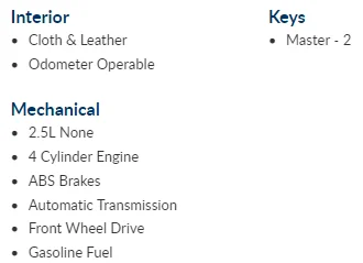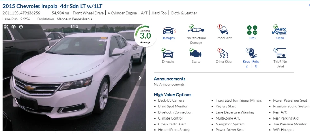 Year:2015 Make:Chevrolet Model:Impala Trim Level:LT Odometer:54,904 mi In-Service Date:Not Available Fuel Type:Gasoline Engine:4 Cylinder Displacement:2.5 L Transmission:Automatic Exterior Color:White Interior Color:Black Window Sticker:Not Available Body Style:Sedan Doors:4 Vehicle Type:Car Salvage: No As Is: No Drive Train:2 Wheel Drive Interior Type:Not Available Top Type:Hard Top Roof Stereo:CD Player Airbags:Dual, Side