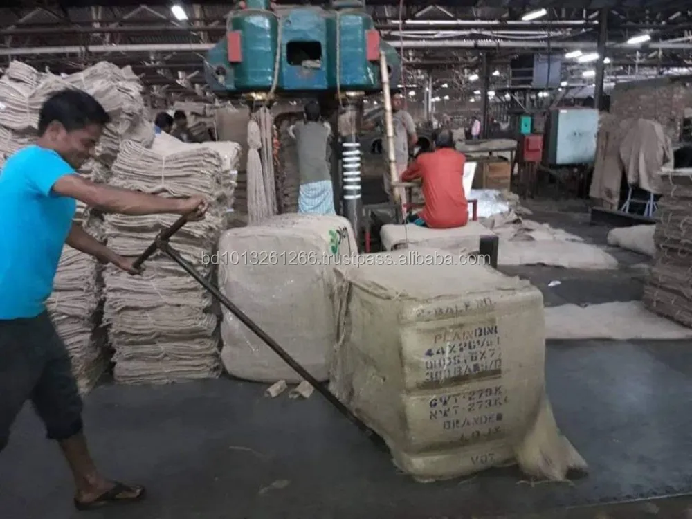 Specification: New Standard Sacking binola jute bag of quality VOT (vegetable oil treated) size 44"(112 cm) x 26.5"(68 cm) , bag weight 907 gram , porter and shot 6 x 7, hemmed at mouth with over head dry sewn and 3 blue stripes in the middle.
