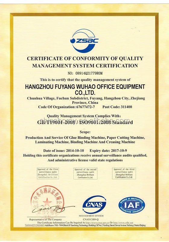 The major products of our corporation are paper cutter, perfect binding machine, glue binding machine, wire binding machine, card cutter, laminating machine, laminaor, card cutter, creasing machine and various of binding materl (Binding plstic comb, double loops wire, spiral coil, paper cover, PVC cover, slide binder,etc). In addition, we also deal with office consumption, such as cover paper of binding,clamp bars, plastic and rubber rings, and iron rings, file bag, ruler.etc. Our products have won high reputation among customer at home and abroad for the reliable performance and novel design.
