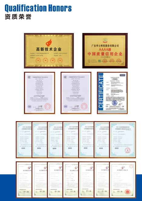 In the past 20 years, Hwashi has obtained more than 50 patents for invention patents, utility model patents, design patents, and software Copyrights. It is the drafting unit of several national standards and industry standards. Hwashi has been awarded "China famous brand", "Guangdong famous brand", "China quality credit enterprise", "world outstanding Chinese businessman association member unit", "Guangdong province science and technology innovation quality management advanced unit", "Guangdong province academician expert enterprise workstation" and many other honorary titles.