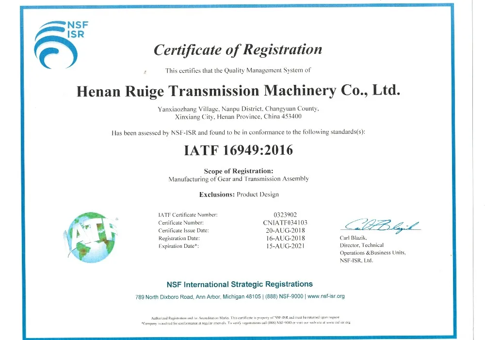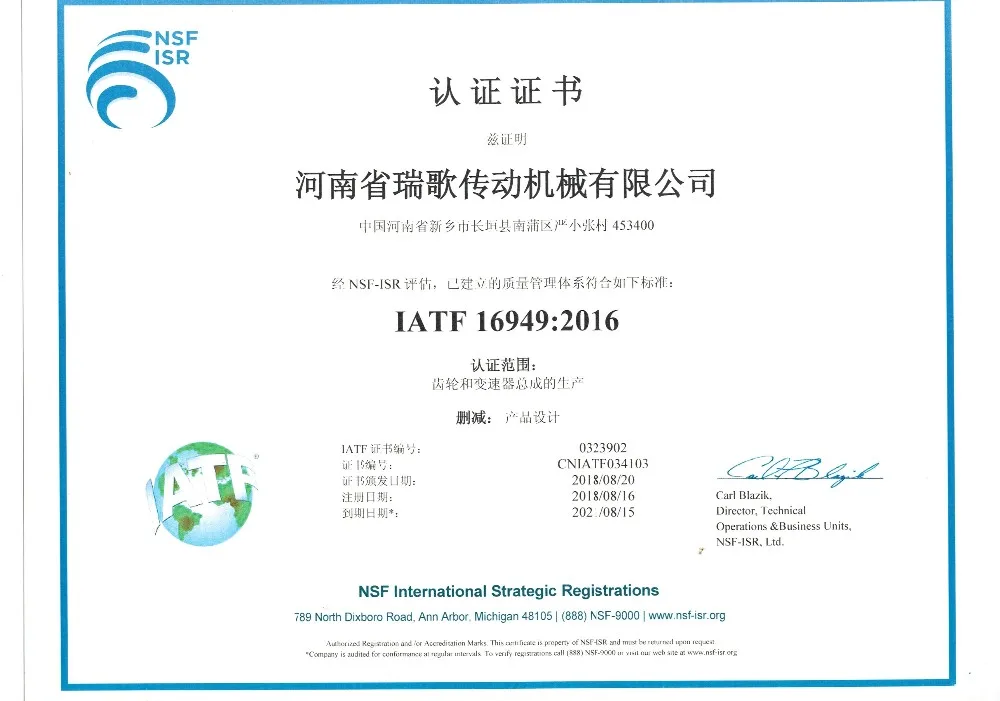 Our company has obtained a number of certifications such as the ISO 9001:2015,IATF 16949:2016 from NSF International Strategic Registrations, the certificate of scientific and technological achievements , the Advanced Technology Enterprise and Henan province science and technology type small and medium enterprise certificate.