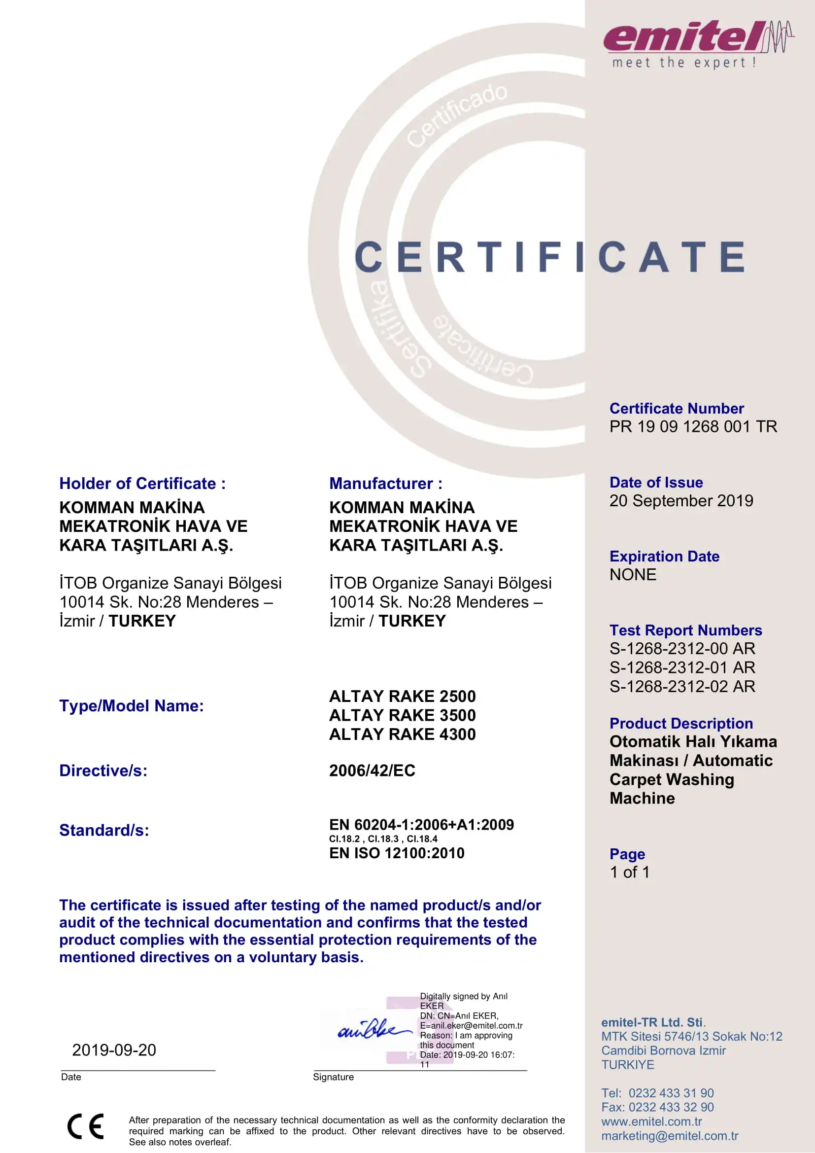 In Total of 8 Compact Brushes ALTAY RAKE 3000 * 4 Disk brushes (1st class high quality heavy duty reducers were used) * 3 mm thickness, high strenght inox main body frame. * High strength conveyor drums with a diameter of 139.7 mm and a thickness of 5 mm * Heavy duty, adjustable Vargel type carpet pressure system. (The most successful linear system of the German lathe type, capable of applying stable pressure.) * Spring pressure system for homogeneous pressure(Equal pressure to every disk brushes) * Reverse roller rake brush system * Roller Rake system with the opposing directional roller brushing(The Most Successful System) * Opposing directional brushing system for rinsing(The Most Successful System) * Adjustable water rinsing system * Roller brush system for cleaning the bottom surface. * Carpet folding system * Capable of cleaning/washing all sorts of carpets. * First class compact infinite conveyor bands(Resistant to Chemicals) * Socketed split band system with adjustable tension. * Versatile easy to use automation and control system. * Optimum operation of the machine with horizontal movement control according to carpet widths. * Possibility to control the speed of all the units manually due to the AC drivers of the infrastructure of the automation system. * Grid system that prevents carpet fringes from wrapping to the middle and lower washing brushes in fringed carpets. * Conical and honing ball bearing system that withstands the pressure of brushes * Safety switches for machine safety. * The machines are compactly designed with a mass production model, and manufacturing and workmanship errors are drawn to the automotive industry level. * Manufactured according to the minimum fault level and the principle of working in the heaviest conditions. * Pre-wetting system 1st class 3 water spraying nozzles and high efficiency are obtained even with a small amount of water. * Our machines are designed to achieve the maximum level of results with a small consumption of energy and water * 3 meters band width - Compact pin conveyor belt * Total 8 brushes. * Voltage : 380-50 / V-Hz * Engine power of the disc brush :0,75 KW * Brushing units: 4 Disc Brushes, 2 Roller Brushes, 2 Rake and Rinse Brushes * Total Power: 12 KW * Engine RPM: 1400 rpm * Brush Diameter: 420 mm * Diameter of the Roller Rake Brush: 280mm * Brushing speed: 200/m * Capable of washing 720 square meter carpets in just 8 hours. * Capable of washing 6 square meter carpet in around 4 minutes * Carpet washing speed per minute: 1,5 min * Electricity consumption in 1 hour: 9KWh * Dimensions (LxWxH): 3660x2230x1760 mm