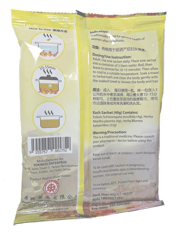 use on sachet daily.place one sachet into a container of 3 liters water.boil,then leave to simmer for 10-15minutes.then allow to cool to a suitable temperature.soak a towel in herbal bath and clean the body gently with the soaked towel or shpwer the body & hair.