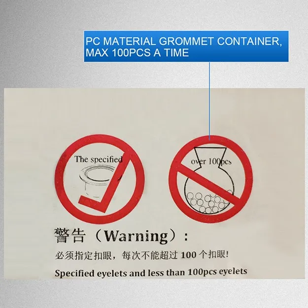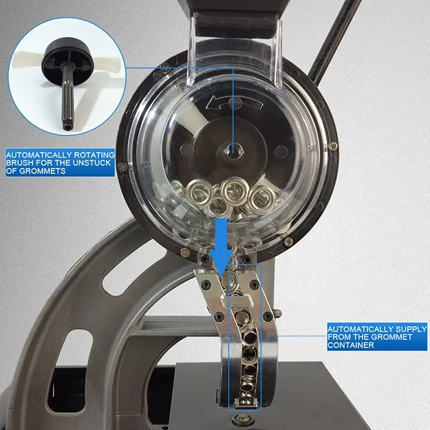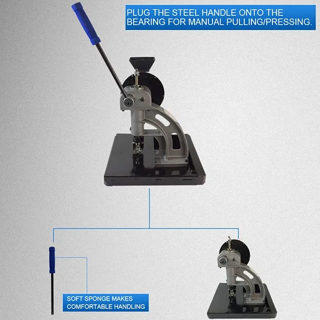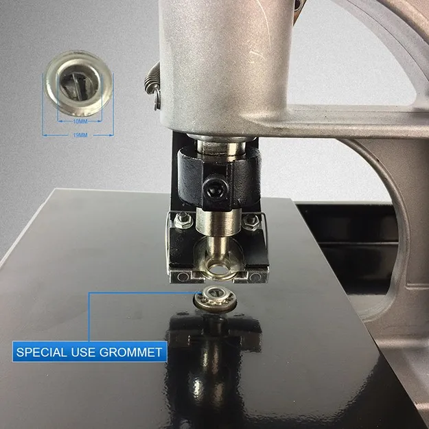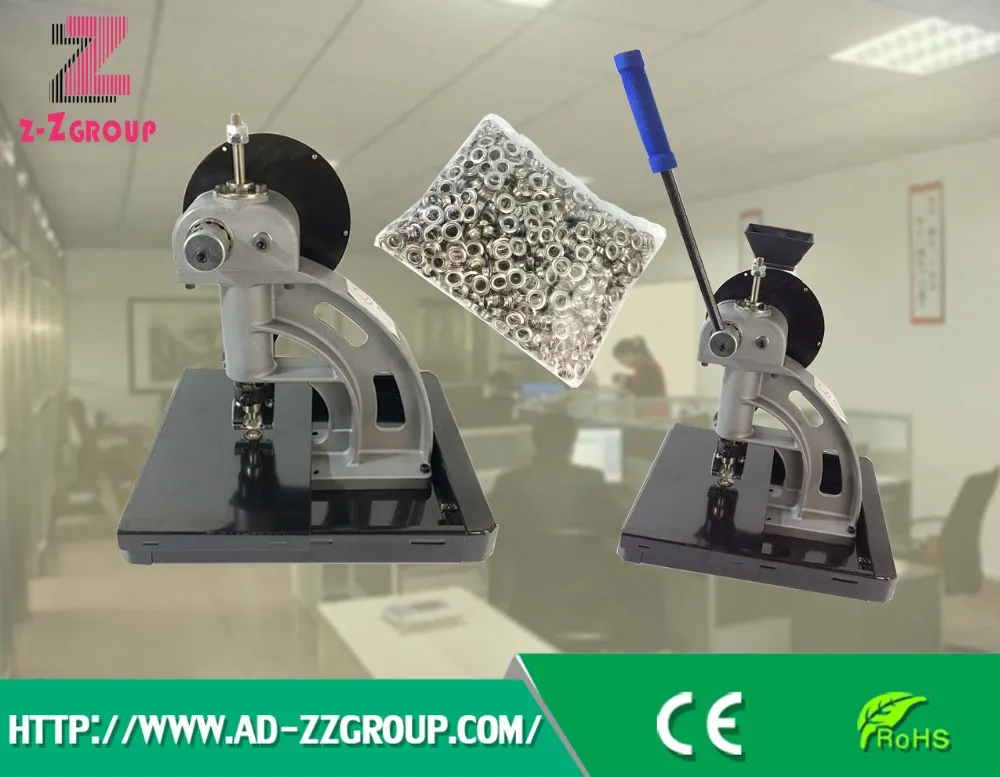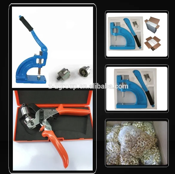 Manual/semi-automatic grommet/ eyelet machine, usually used in binding and riveting, and it also has a wide range of uses, such as suitcases and bags, clothing leathers, leather belts and waist belts, stationeries, especially poster, tents and rain gears,etc.