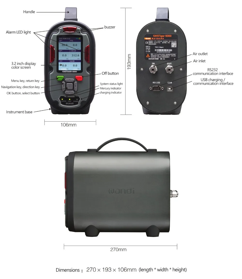 | \t Sampling method | \t Active pumping type, built-in air pump can be opened or closed independently, flow rate 500mL/min |