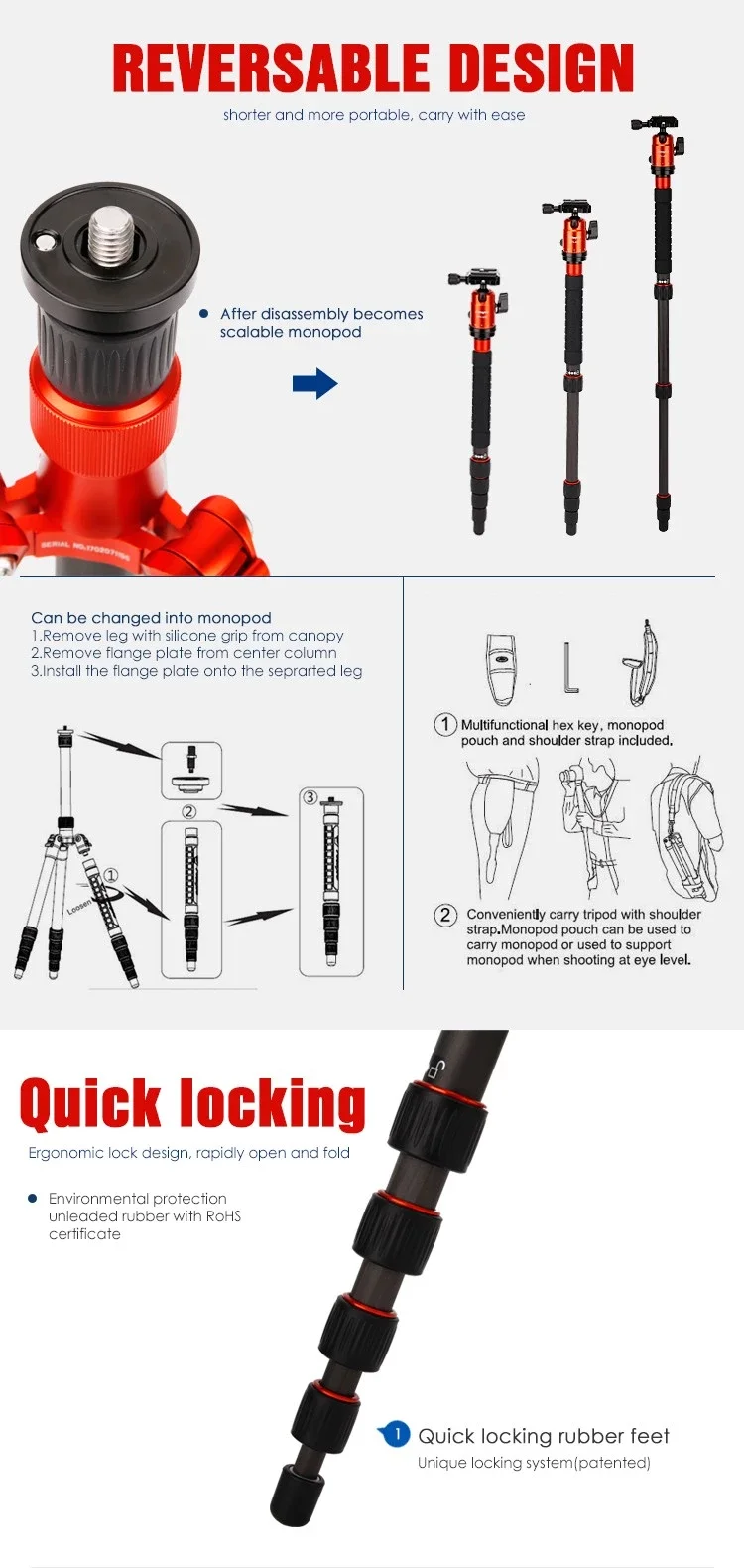 Three adjustable legs can be folded 180 degrees reversely, the folded tripod with compact size of 16.92'' ( 430mm ), can be easily put into a backpack.