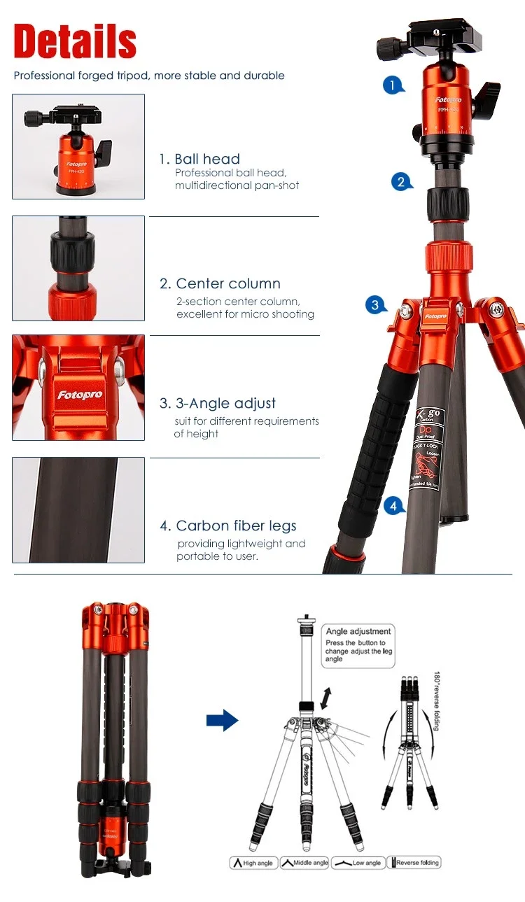 Fotopro FPH-42Q Ball head is included which is perfect lightweight, sturdy. And 3/8 ball head serew Compatibles with most cameras and ball heads.