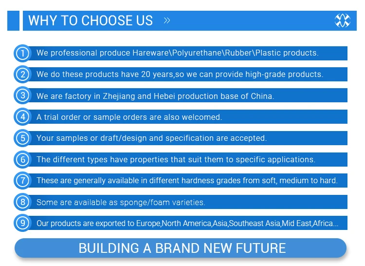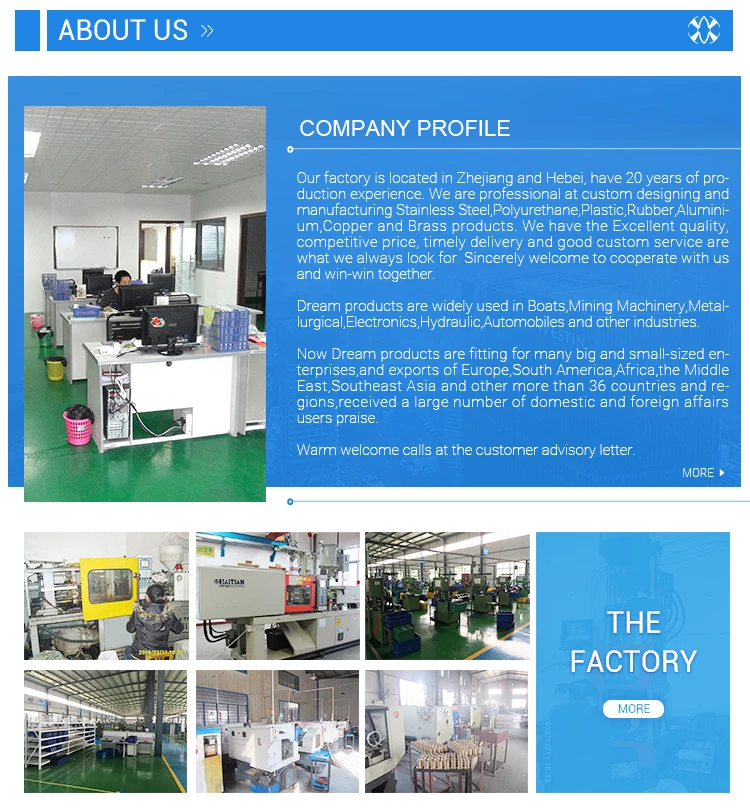 Our factory is located in Zhejiang and Hebei, have 20 years of production experience. We are professional at custom designing and manufacturing Polyurethane, Rubber, Plastic, Stainless Steel, Aluminium, Copper and Brass products. We have the Excellent quality, competitive price, timely delivery and good custom service are what we always look for. Sincerely welcome to cooperate with us and win-win together.