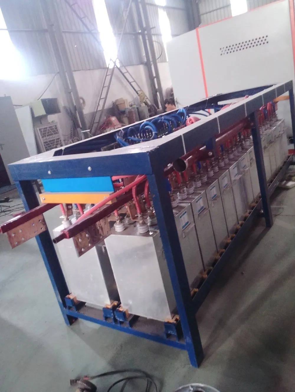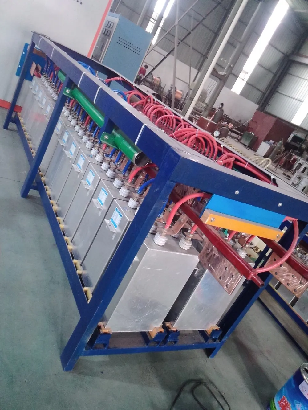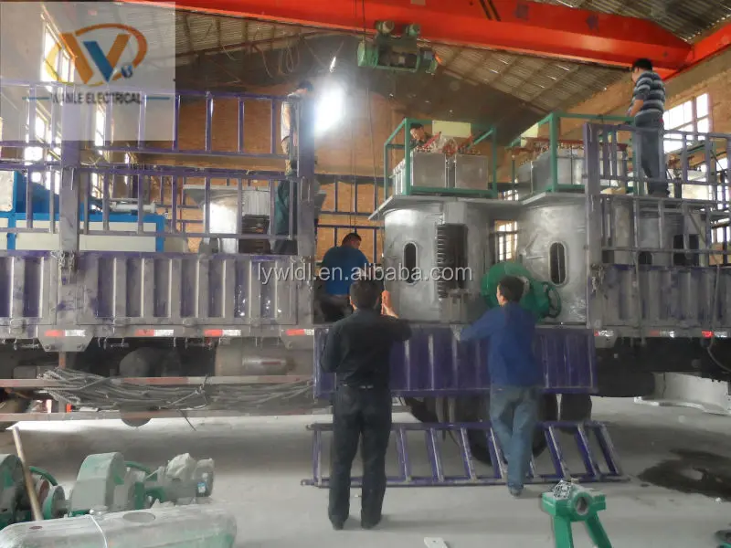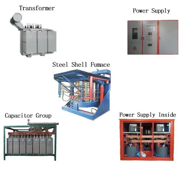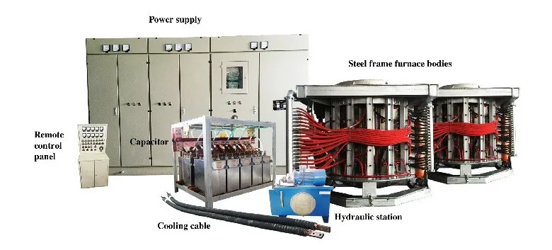 The steel shell medium frequency melting furnace was composed by the medium frequency electric power cabinet, the implement capacitor array, the furnace body, the magnetic yoke and water cooling cable, hydraulic station, the furnace discharging control cabinet, was mainly used in melting the steel, iron, copper ,aluminum and the alloy, it has the advantage of high melting efficiency ,energy saving, the even metal composition, less heat loss ,temperature rising faster and easy control, suitable for many kinds of metal melting.