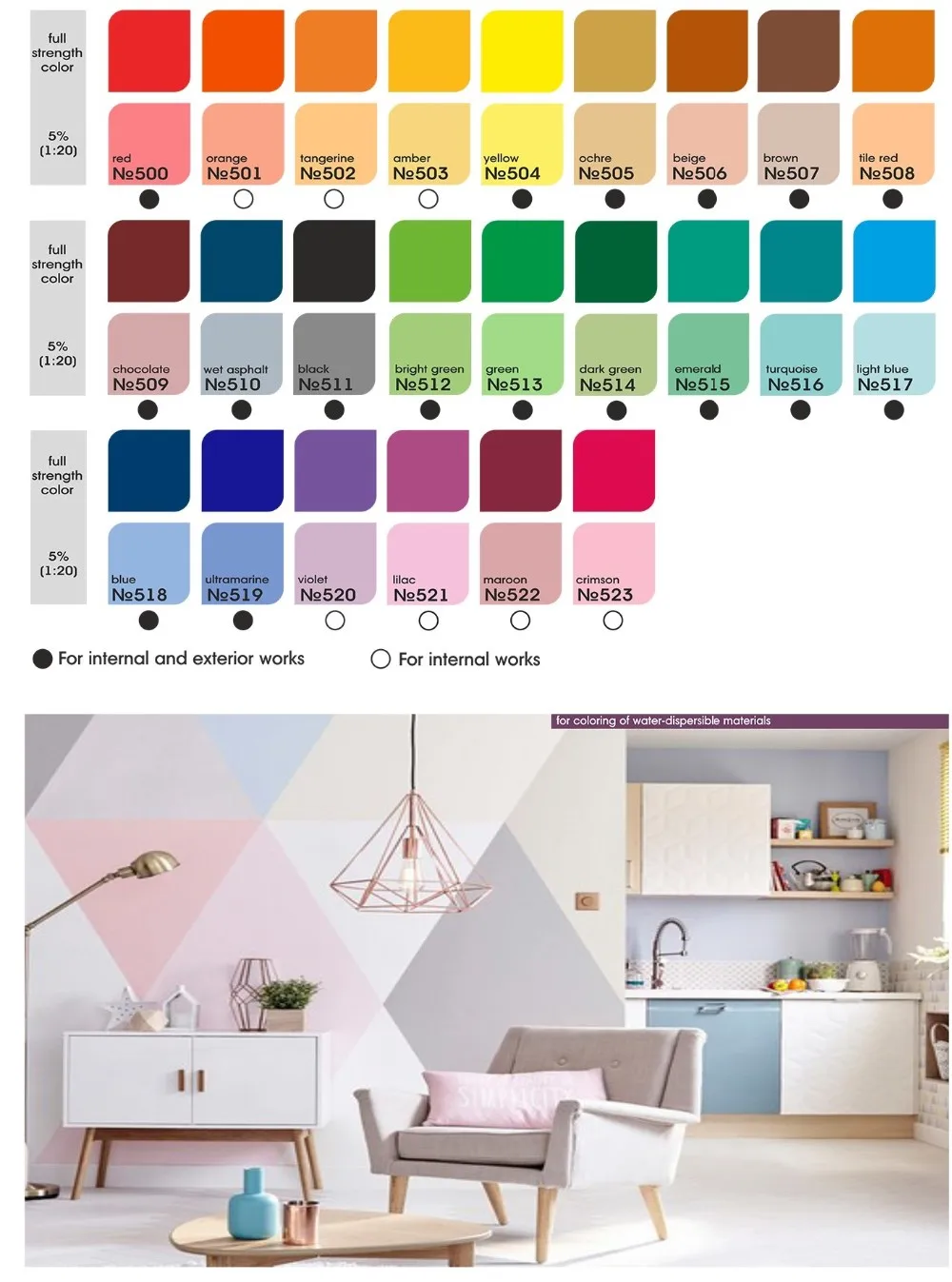 Coloring emusion paint used in undiluted form for coloring of water-dispersible materials.