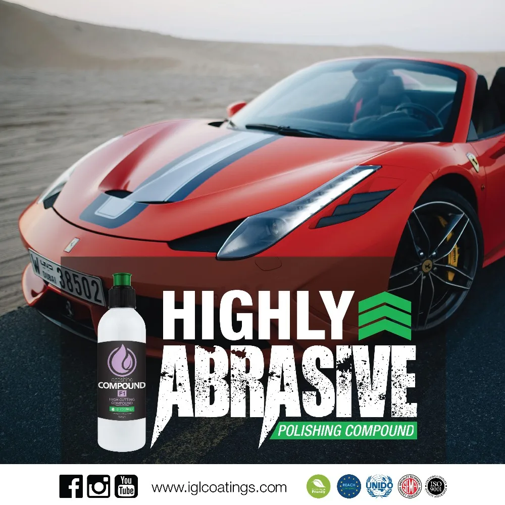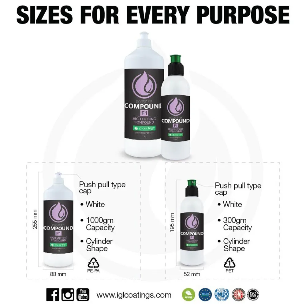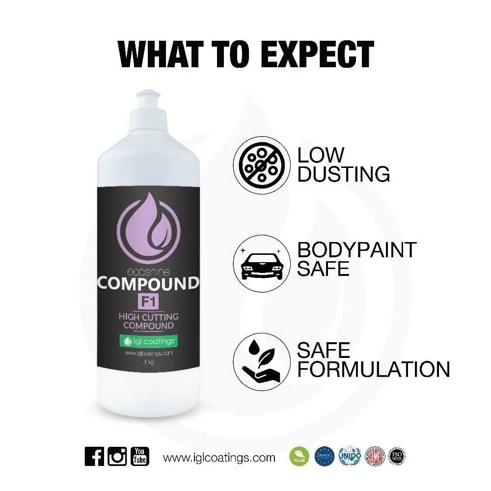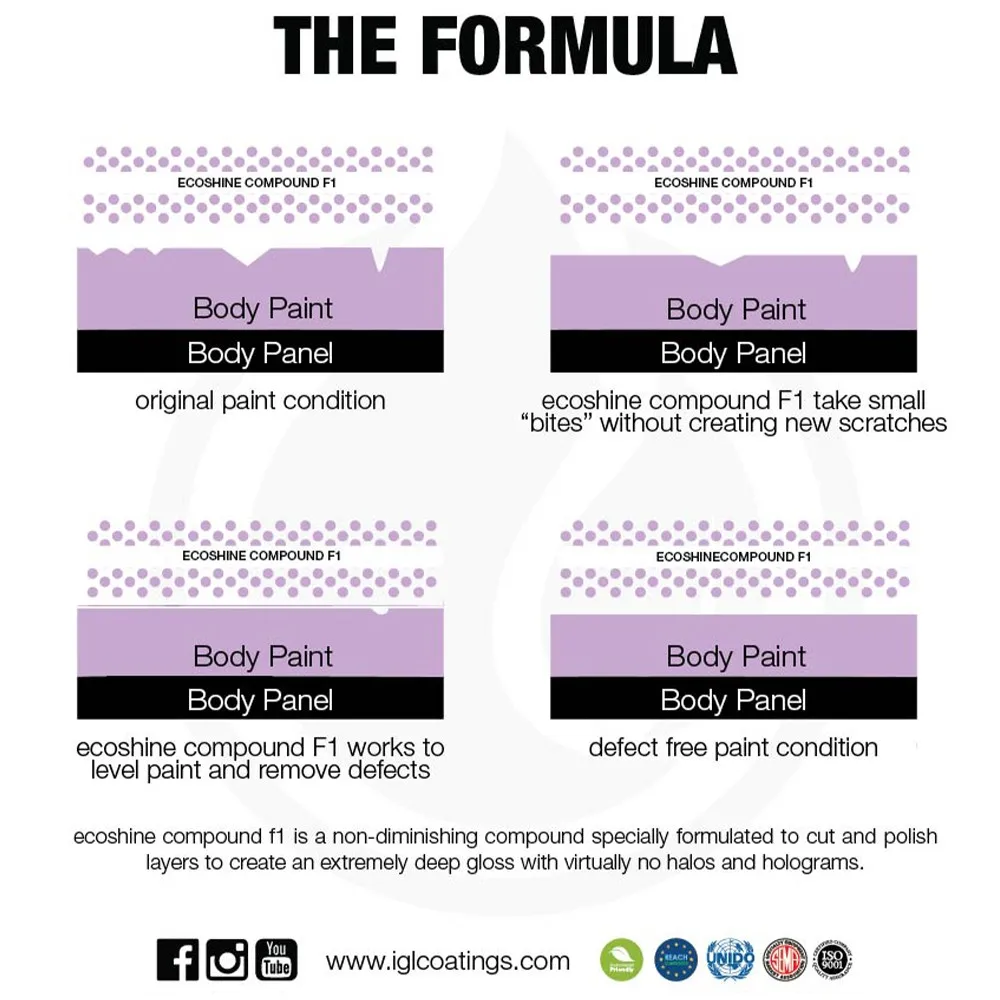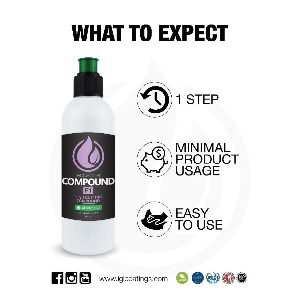 Ecoshine Compound F1, is a nanotechnology based very high abrasive polishing compound formulated with innovative abrasion technology which can also finish ready for vehicle delivery. The compound f1 is an excellent ONE STEP product.is highly efficient at correcting paint that are failing, dull, marred and P1500-P3000 sand scratches and at the final stages it creates an extremely deep gloss, with virtually no halos and hologram. Results are highly dependent on the hardness of the treated paints. It may be used both on oxidised surfaces and new fully dried paints. Versus other heavy cutting product that has high dusting, ecoshine compound f1 is the cleanest product in existence while at the same time providing high finish, clarity and residue removal. Cutting power can be increased by using a microfiber or wool pad with ecoshine compound f1.