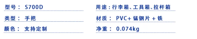 | 1.Model: 5700D Usage: Luggage, Toolbox, Pull-rod Box Type: Handle Material: PVC + Manganese Steel Plate + Iron Color: Support Customized Net Weight: 0.074kg |