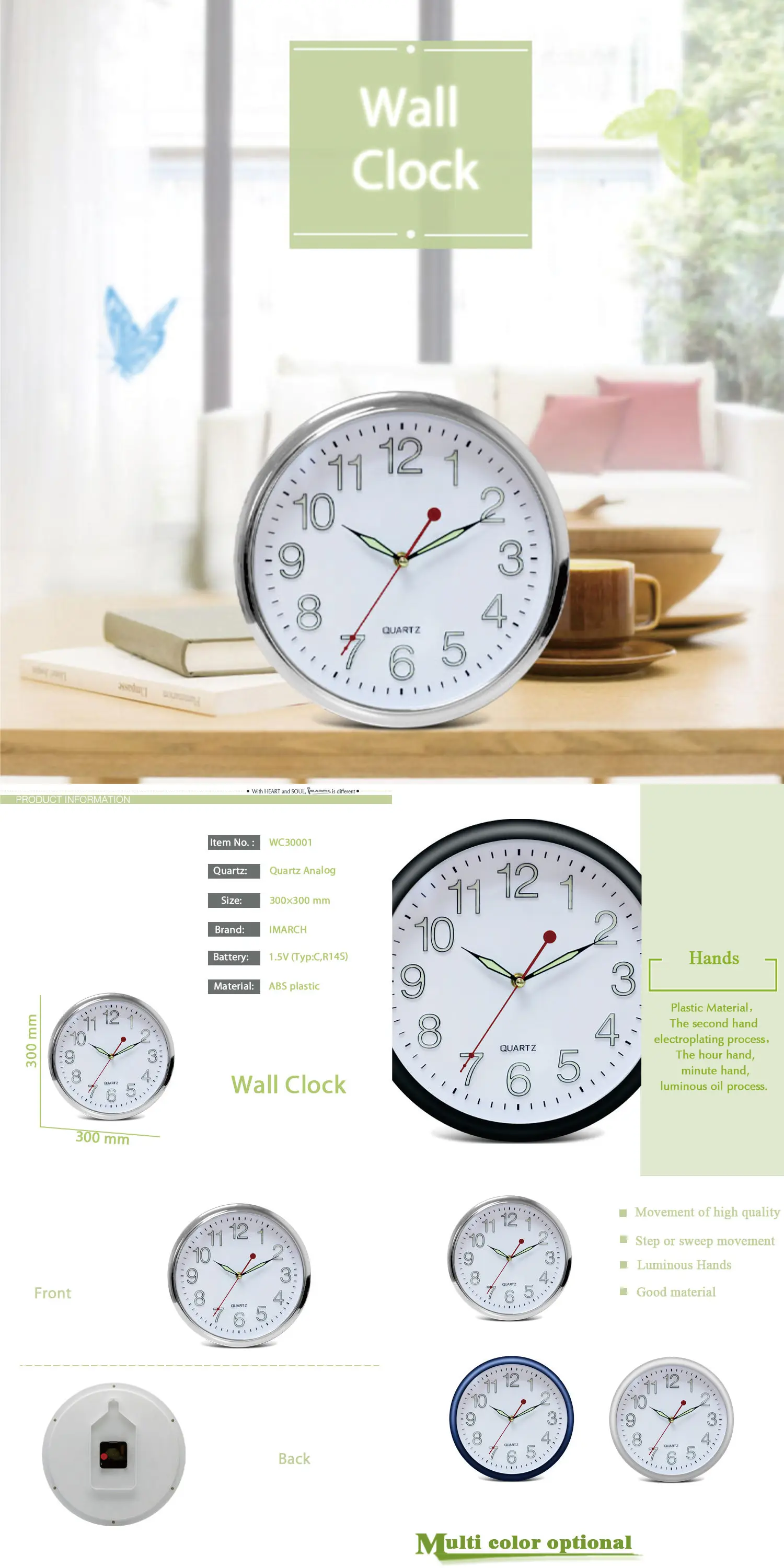 Imarch WC30001 Chinese factory OEM Round Shape Wall Clock Silent Non Ticking Quality Quartz For Home Office School Clock