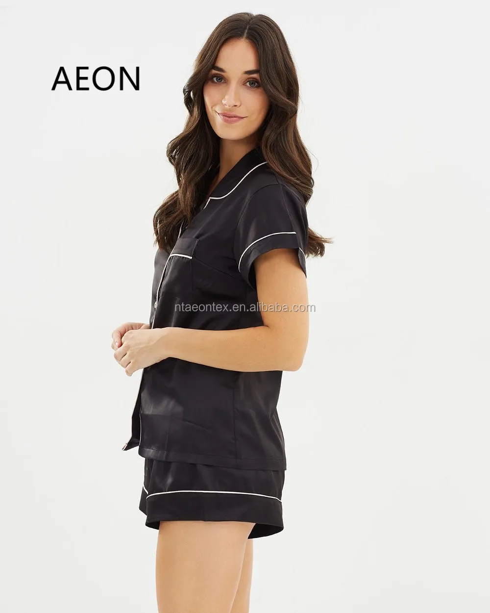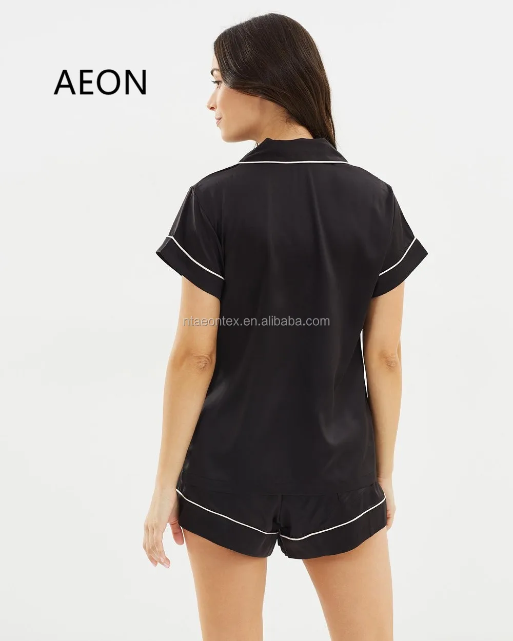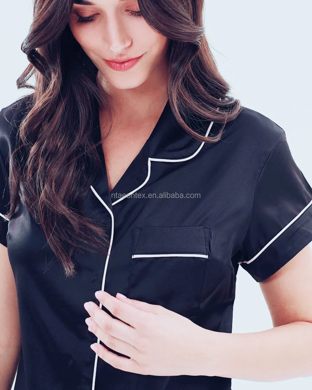 A satin in a pajama-inspired design, notched collar, button front, short sleeves, and contrast piping.
