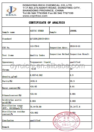 In essence, paint, medicine, advanced printing ink, collodion cotton, nitrocellulose, dyes and other industries widely used, is one of dosage larger synthetic spices in edible flavor, a large number of used for deployment of bananas, pears, peaches, pineapple, grape scent flavor, etc. Also can be used as extraction agent and dehydrating agent, can also be used in food packaging color printing, etc.Extracts of tannin extracts are used in desulfurization, cigarette materials, oil field drilling, metal flotation, descaling, etc
